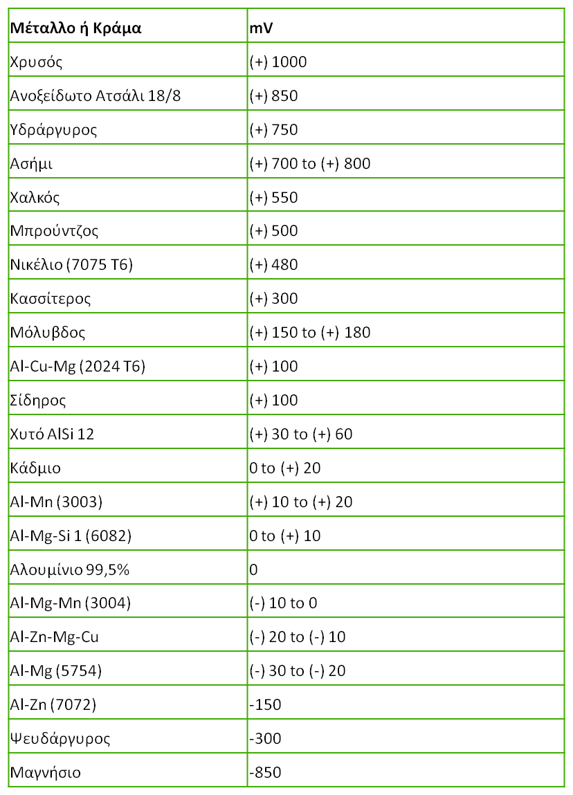 Σειρά Ηλεκτροθετικότητας Μετάλλων και Κραμάτων σε σχέση με καθαρό αλουμίνιο (ονομαστικές τιμές σε mV συγκρινόμενες με εκείνες που αντιστοιχούν σε αλουμίνιο 99,5 % καθαρότητας εμβαπτισμένο σε διάλυμα NaCl)